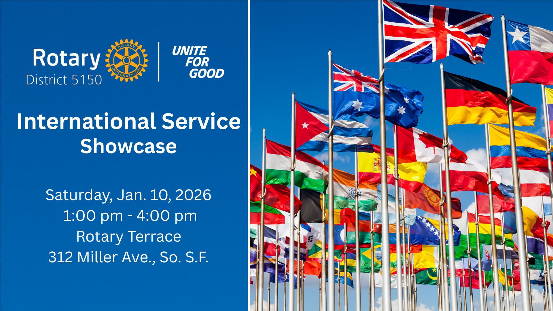 Rotary District 5150 stretches across Marin, San Francisco and San Mateo counties of the San Francisco Bay area. Our Rotary club members are people of action and inspired individuals who translate their passions into relevant social causes to change lives in communities, both locally and globally. Rotary International forms a global network of business, professional, and community leaders who volunteer their time and talents to serve communities and form strong, lasting friendships in the process. Join us!